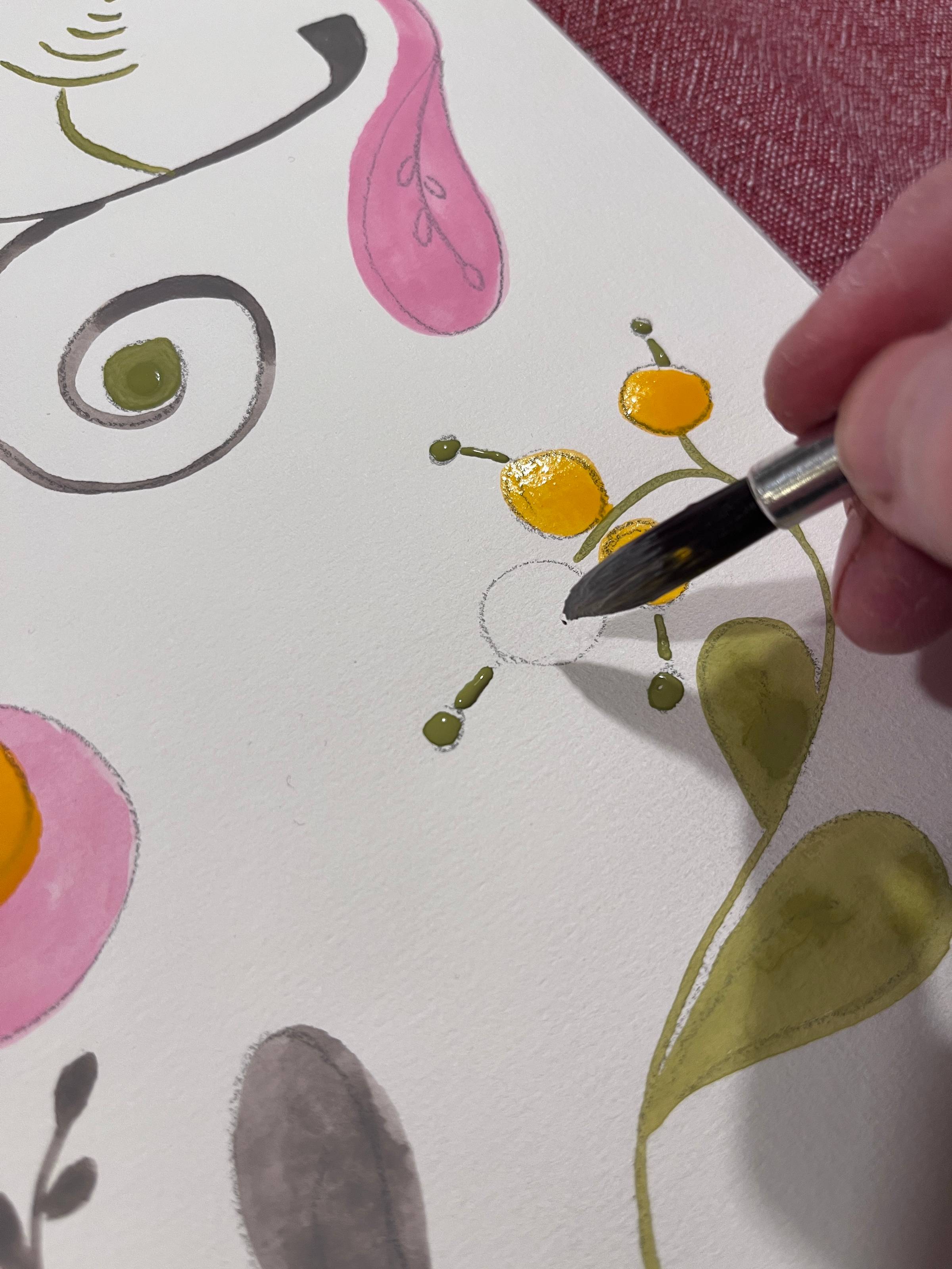Det känns härligt att drömma mig bort med färg och penslar igen. Jag tänker sommartankar och smörblommor. När handens rörelser hittar känslan som jag vill förmedla med detta nya mönster är lyckan gjord.