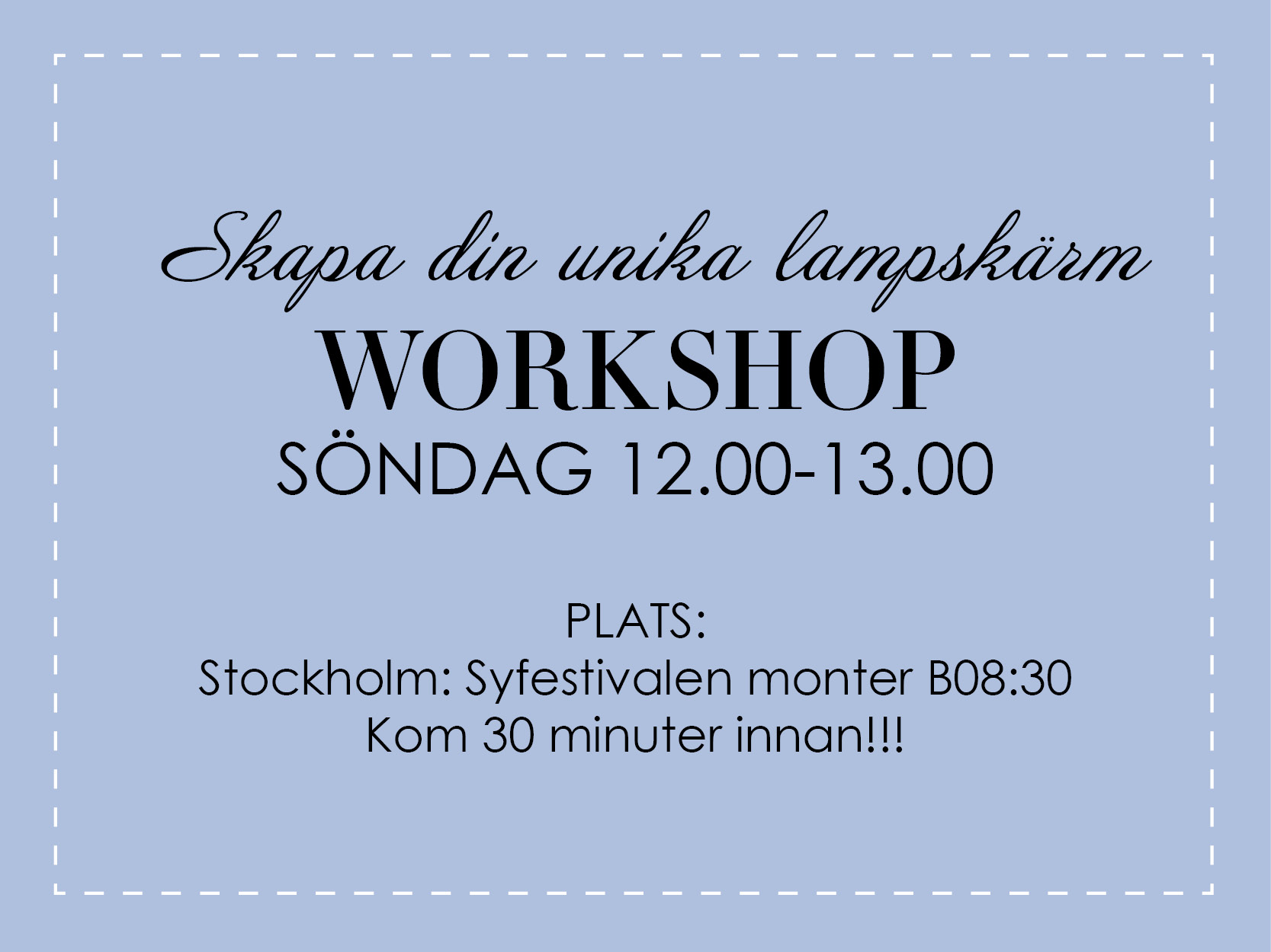 Obs! Kom 30 minuter innan workshopen börjar så du kan välja tyg och stryka det innan kursen startar. På så sätt får du mer tid under workshopen.